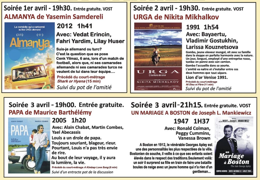 Festival 2026 : La Famille… mercredi 1er AvrilJeudi 2et vendredi 3 à la Fédération Française du BâtimentEntrée libre 32 rue de l’Ocrerie à Auxerre3 soirées – 4 films: venez vous évader! Chaque soir, un film précédé d’un court-métrage sera projeté;la séance étant suivie du pot de l’amitié.le vendredi:deux longs-métrages seront présentés avec un entracte. Mercredi 1er avril – 19h30.– ALMANYA de Yasemin SamdereliJeudi 2 avril – 19h30– URGA de Nikita MikhalkovVendredi 3 avril – 19h00. PAPA de Maurice Barthélémy– 21h15. UN MARIAGE A BOSTON de Joseph L. Mankiewicz
